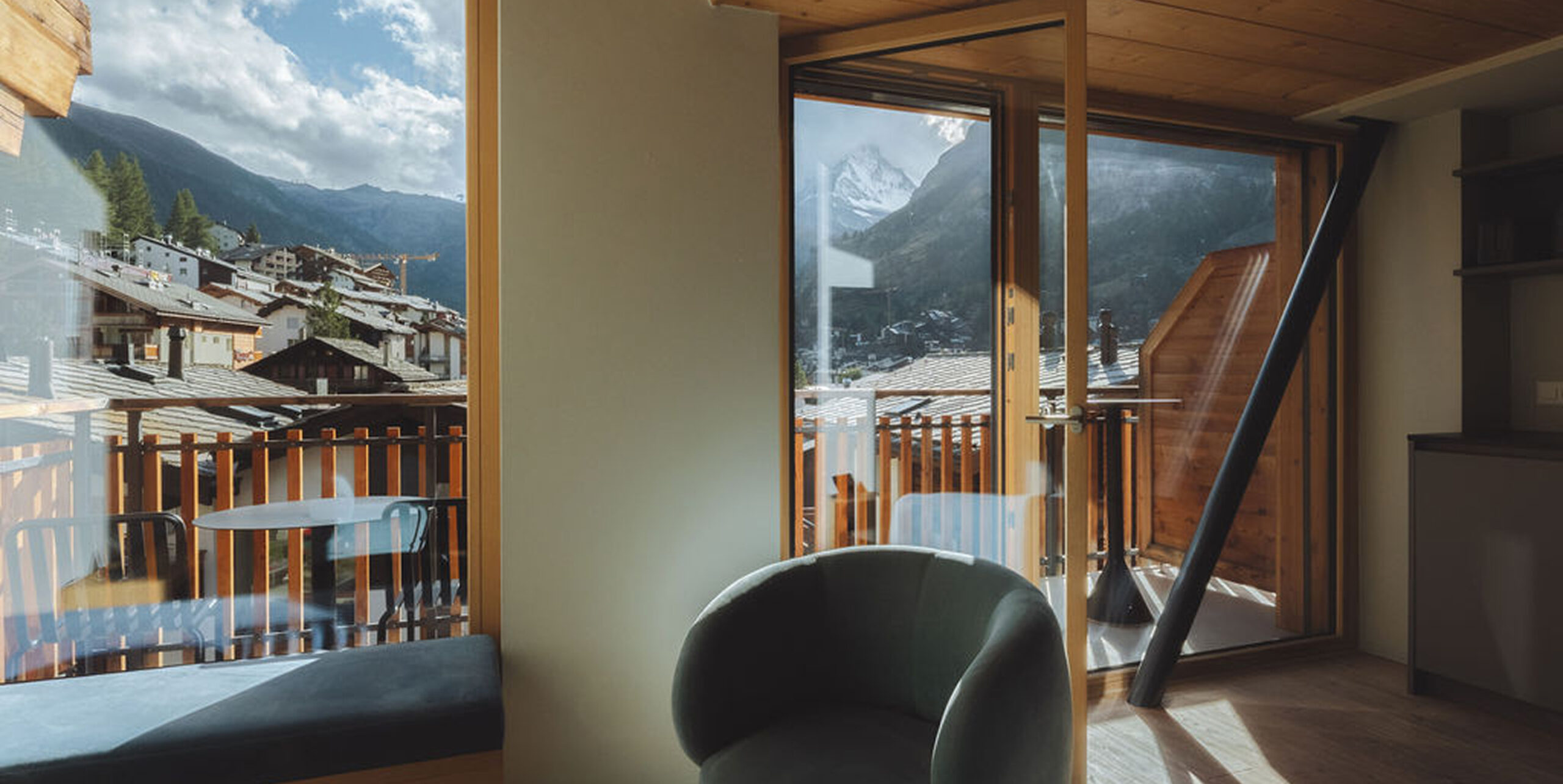 Vier separate Schlafzimmer sorgen für Komfort und Rückzug, während der Hauptraum mit grosszügigen Erkerfenstern und einem Balkon einen atemberaubenden Blick auf das Matterhorn eröffnet.