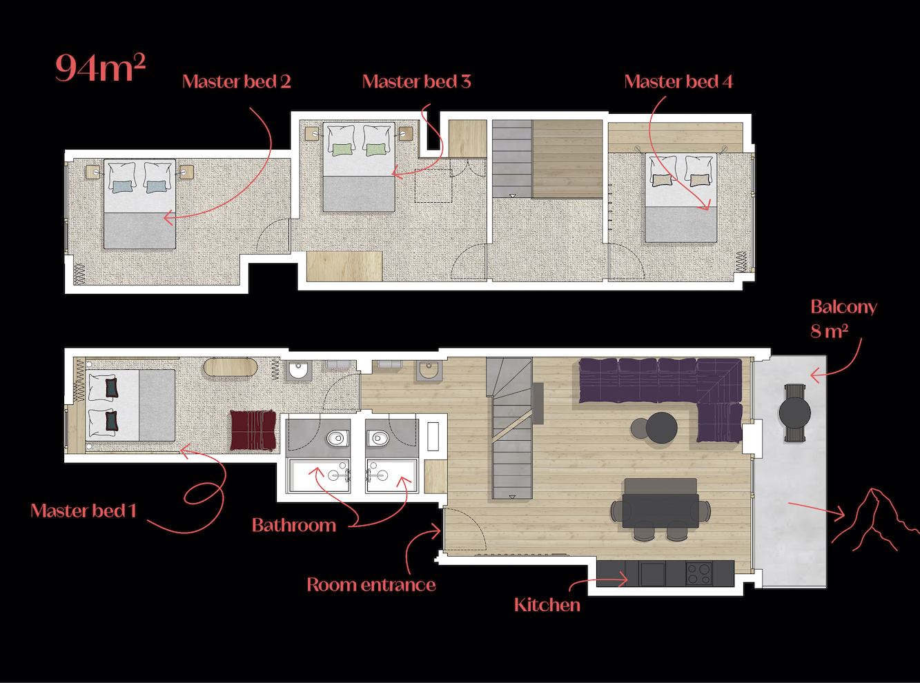 Vier separate Schlafzimmer sorgen für Komfort und Rückzug, während der Hauptraum mit grosszügigen Erkerfenstern und einem Balkon einen atemberaubenden Blick auf das Matterhorn eröffnet.