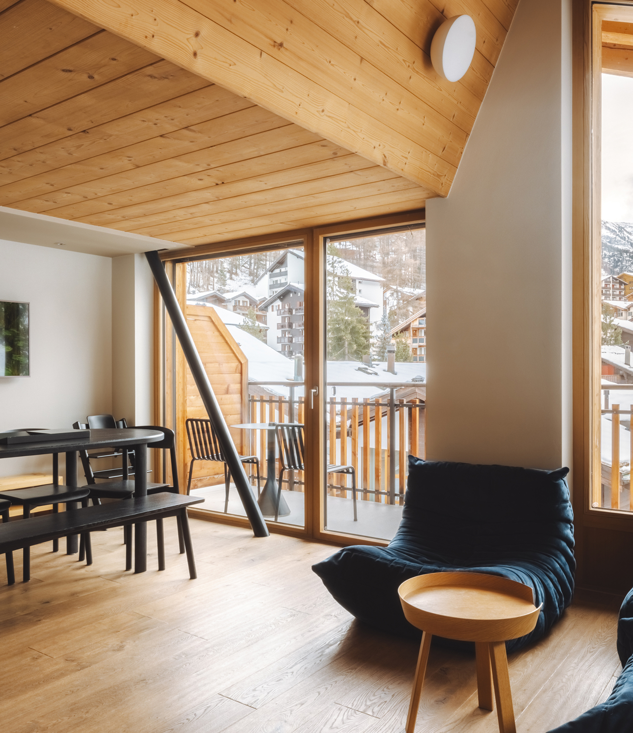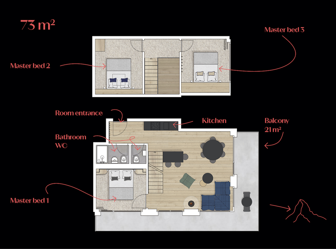 Das Penthouse Matterhorn ist eine aussergewöhnliche Maisonette-Wohnung für bis zu sechs Personen. Drei separate Schlafzimmer sorgen für Komfort und Privatsphäre, während die stilvolle Architektur und das durchdachte Design den Aufenthalt besonders machen. Die voll ausgestattete Küche und das Wohnzimmer öffnen sich zu grossen Erkerfenstern mit direktem Blick auf das Matterhorn.