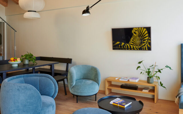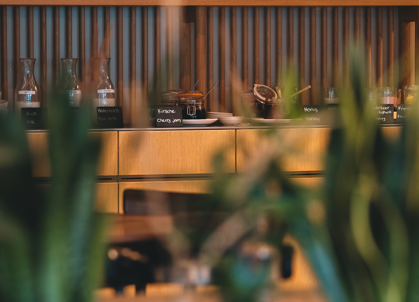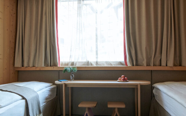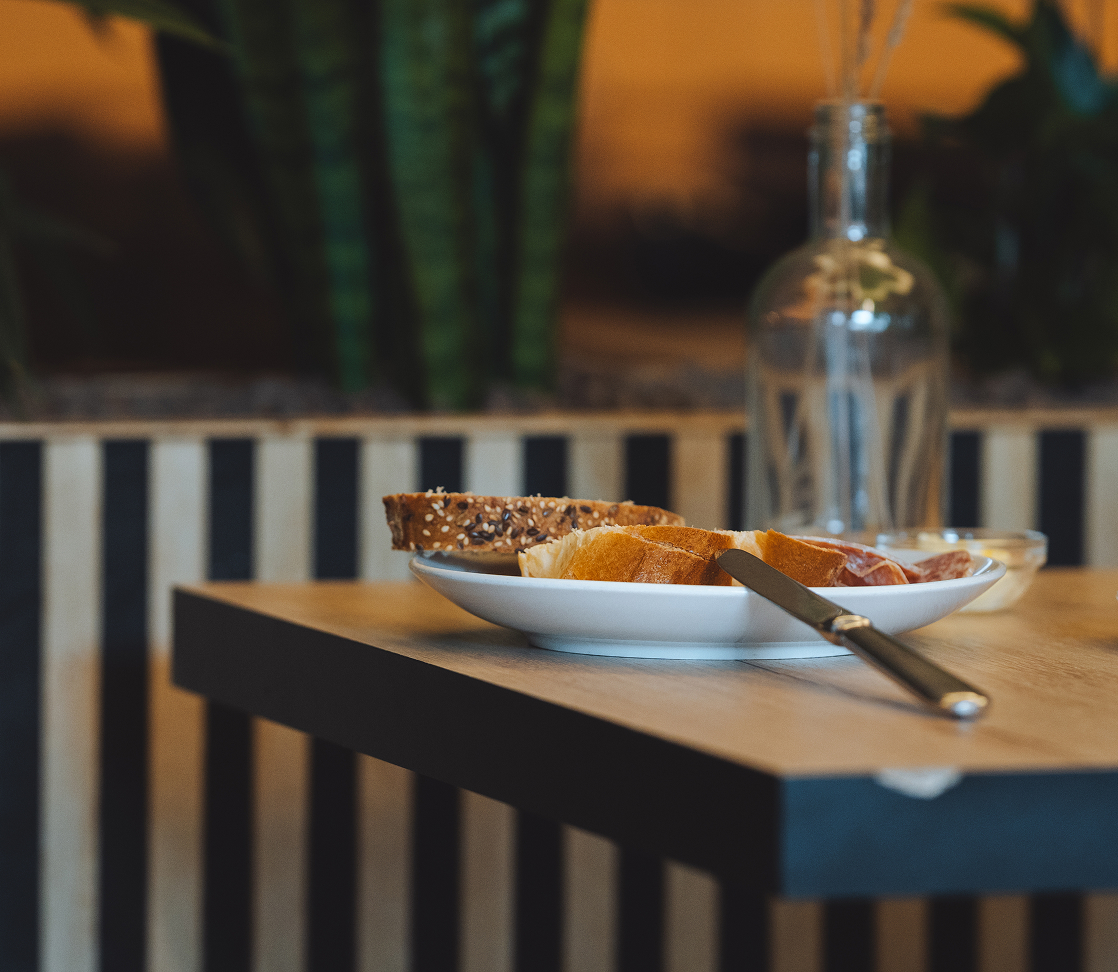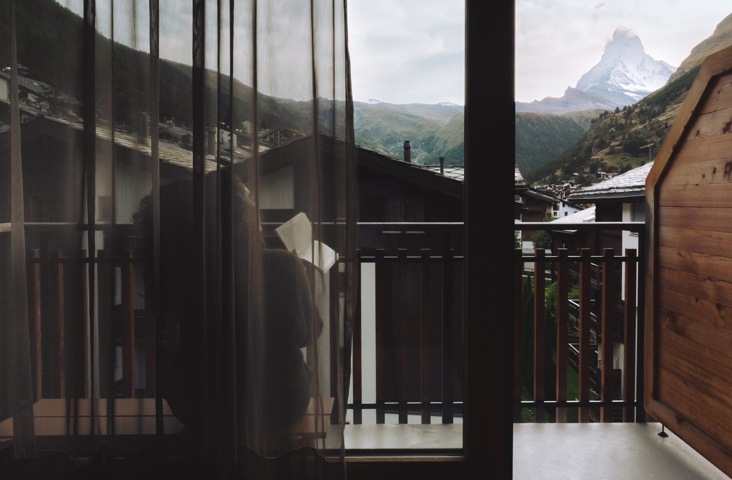 The terrace opens to the Matterhorn, making the mountain a constant companion.