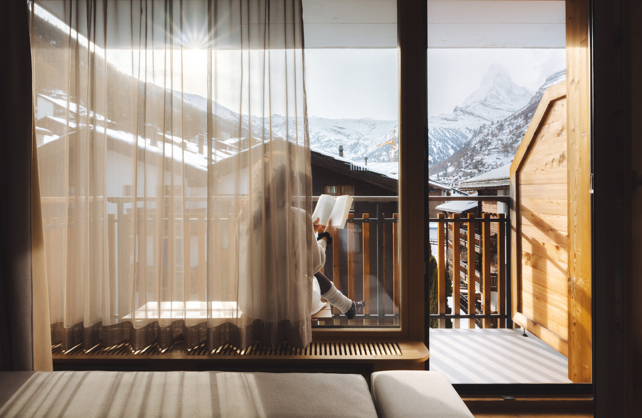 La Chambre Matterhorn t’offre une vue latérale sur le panorama alpin et combine confort et légèreté.