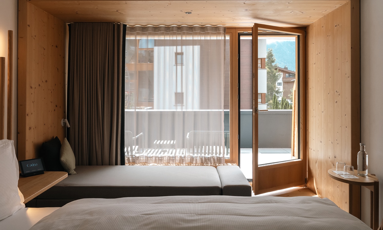 Das Matterhorn Deluxe ist grosszügig geschnitten und behaglich zugleich. Ausgestattet mit einem hochwertigen Kingsize-Bett und der Möglichkeit, bis zu zwei zusätzliche Betten hinzuzufügen, eignet es sich ideal für Paare, kleine Familien oder Freunde. Die Terrasse eröffnet einen atemberaubenden Blick auf das Matterhorn, das hier ganz nah wirkt. Ein gepflegter Duschbereich, ein kleiner Beistelltisch und durchdachte Details machen das Zimmer zu einem echten Zuhause fernab des Alltags.