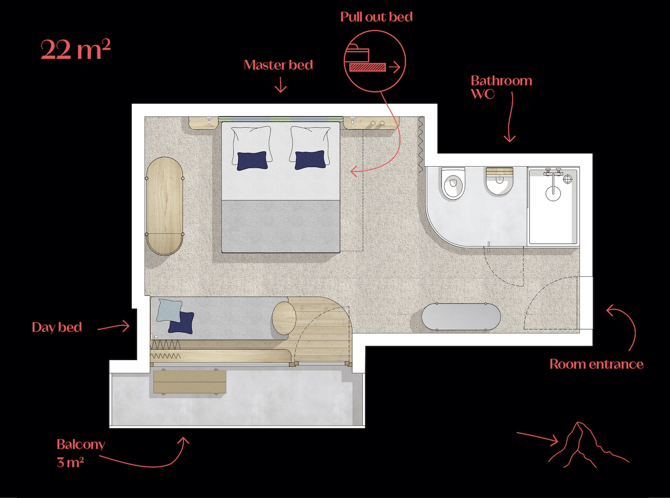 Das Matterhorn Zimmer ist ein gemütliches Doppelzimmer mit seitlichem Blick auf das Matterhorn. Ausgestattet mit einem hochwertigen Kingsize-Bett und der Möglichkeit für ein zusätzliches Bett auf Anfrage, bietet es viel Raum zum Wohlfühlen. Das kompakte Bad, ein kleiner Beistelltisch und die grosszügige Terrasse schaffen eine Atmosphäre, in der man sich sofort zuhause fühlt.